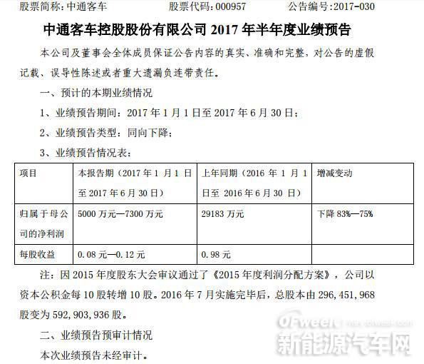 根據(jù)中通客車于7月12日披露的業(yè)績預(yù)告,公司預(yù)計2017年上半年歸屬于母公司的凈利潤5000萬至7300萬元,同比下降75%至83%。