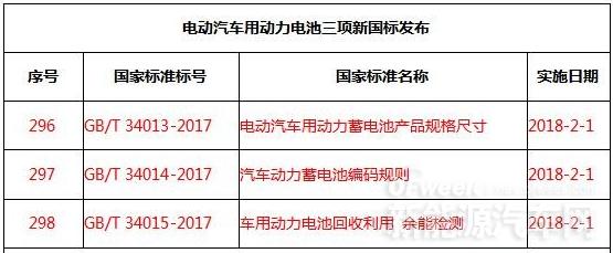 7月12日,記者獲悉,國家質(zhì)量監(jiān)督檢驗檢疫總局、國家標(biāo)準(zhǔn)化管理委員會批準(zhǔn)312項國家標(biāo)準(zhǔn),其中電動汽車用動力電池相關(guān)標(biāo)準(zhǔn)3項,分別為GB/T 34013-2017《電動汽車用動力蓄電池產(chǎn)品規(guī)格尺寸》、GB/T 34014-2017《汽車動力蓄電池編碼規(guī)則》、GB/T 34015-2017《車用動力電池回收利用 余能檢測》,3項標(biāo)準(zhǔn)將于2018年2月1日起實施。